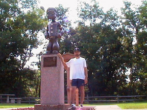 I hit some more neat milestones today. I rode into Chester, Illinois - the home of Popeye. The creator of the Popeye cartoon was born here and the town has gone Popeye crazy. Many businesses have "Popeye" in their name, the water tower has a large cartoon of Popeye on it and there are pictures of Popeye everywhere. The first picture is of me entering town and the second is at the Popeye statue at a small park just before the interstate bridge.