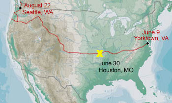 This was a tough day of riding. I got a semi-late start (7:45am) and stopeed for a while at some attractions. The first 30 miles of the trip were very tough. I did over100 feet of climbing per mile of travel for the first 25 miles with little net gain in elevation. I though I was back in the Appalachians again! The hardest part is over now that I'm up on a plateau west of the Ozark National Scenic Waterways. There is little elevation change from here to Kansas where I will begin a very gradual ascent to the beginning of the Rockies.