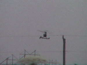 I saw something very unique today. There was a utility line crew working on some power lines today. The unusual thing is that they were using a helicopter to work on the lines. One guy sits on a platform to inspect and repair the line. Absolutely amazing. This photo was extracted from the video I took of them - that's why it's washed out.