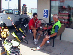 We rigged up one of my Kevlar temporary spokes and Joe and Geert trued the wheel as best they could at a convenience store. When we got to Hutchinson Geert got a replacement spoke and had his wheel trued at Harley's bike shop. It's a good thing that it happened now since the next bike shop is not until Pueblo, Colorado - over 400 miles from here. Here is a picture of the master mechanics at work at the Conoco station we stopped at..