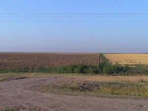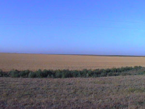 It turns out that the growing season is done early here in the high plains. A few fields still have corn but are heavily irrigated. Hay is cut nearly year round here as well. The common crops are soybeans, wheat and other grains, and corn. This has been a particularly dry season - they only received six inches of rain in the past six months. The picture below shows two fields shortly after harvest. The left field had corn and the right field had wheat.