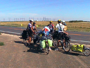 We met up with a group of four riders about half way through the day. It is common courtesy to stop and talk to all other riders to share information. They are actually two pair of riders but have been travelling together for a week or so. The two riders in the foreground and facing left are Geert and Joe, my riding companions. The rider to the far left and far right are together and the other two riders make the other pair. The guy on the far right has a tremendous amount of cycling experience. He cycled around the world from 1986-88 and this is his third cross country trip. He's riding a 23 year-old Trek road bike that has accompanied him on every journey. The only parts that are original to the bike are the frame, seatpost, and handlebars. The second pair is towing BOBs and they say that I'm the first recumbent they have seen since they started. I have yet to see another recumbent but I hear that there is one 'bent rider a day ahead of us. They let us know that the next few days will continue to be dry, hot and dusty. The rest of the ride in the mountains should be just beautiful. We shared with them information about the bridge that is out about three days ahead.