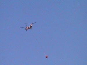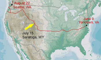 There are some forest fires around here and I spotted this helicopter picking up water from the Platte River just before reaching Saratoga. A fire started the other day that is now threatening Steamboat Springs, a town I passed within 20 miles of yesterday. This entire section of the country is experiencing extreme drought. The owner of the Mangy Moose Saloon (where we had lunch) said that they have only received about 1/4 inch of rain since January. All of the reservoirs, streams and rivers are nearly completely dry.