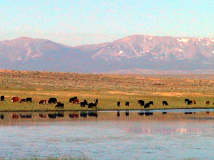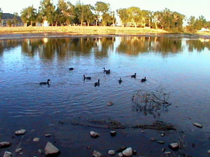 This picture of was taken early in the morning at a small pond just south of Cowdrey, Colorado. There are some ranches around here but most of the land is barren, dry, and covered with scrub. A few farmers grow crops but they have to irrigate heavily. It's neat to see a brilliant, green field every once in a while.