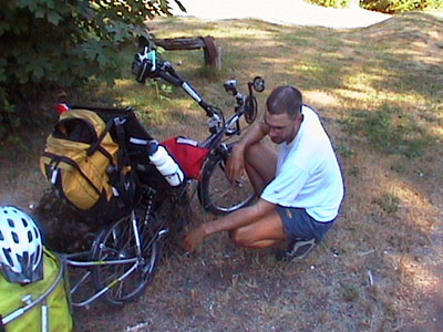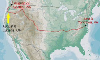 I went to the Bike Friday showroom/factory today in Eugene. They had a Schwalbe touring tire that will work very well on the rear wheel for the rest of the journey and more. I talked with Mike Kelly, one of their sales consultants, about their bikes and all the options they offer. I have considered touring in Europe and their bikes that fit in suitcases seem like a perfect solution. I'll have to consider it as my next journey. If I cross Europe in a future summer then I'll just be left with Asia to complete my round-the-globe cycling accomplishment. Perhaps I won't... Who knows?