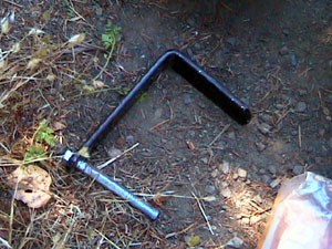 Here's what happened: I was riding down a hill on route 126 between Walton and Mapleton at about 22 miles per hour. The road curved to the right and a bridge narrowed the road quite a bit. I went onto the bridge with a tractor-trailer behind me but he didn't give me much room. I was squeezed between him and the bridge's sidewalk curb. A chunk of metal was lying in the road right in my way and I didn't have time to stop so I hit it square on. (I recovered the culprit and it's shown in the picture to the right.) My front tire blew out immediately and I lost control, weaving around on the edge of the road. When I left the bridge I hit the gravel shoulder and totally lost it. My bike went down on its right side and I went down with it. Here's the damage report: