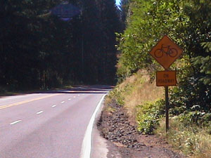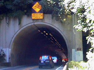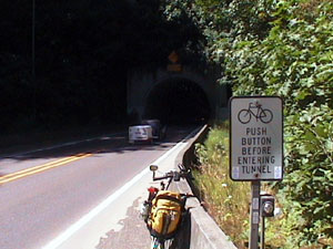 Since the route is heavily traveled by bikers and there are few shoulders, the state has erected some safety signs to alert motorists of our presence. Unfortunately, many people on the road today were speeding and gave us very little room. A tunnel ten miles before Mapleton has special equipment for biker safety. A button on the side of the road makes the lights on the sign above the road blink to alert motorists of our presence.