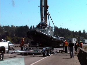 The call was for an overturned boat on Interstate 5. An overturned boat on an interstate highway? It turns out that the Richmond, California police department just took delivery of a brand new 36 foot intercept and rescue boat in northern Washington and were driving it back to California. This thing was so new that it had never been in the water before and had all the bells and whistles that are common to such a ship. I think it can probably haul through the water with its twin 250 horsepower Yamaha 4-stroke outboard motors and power trim tabs. They were southbound on I-5 and lost control just before exit 39. The truck and trailer did a 180° spin and the boat flew right off the back of the trailer, hit the pavement going backward, and overturned.