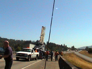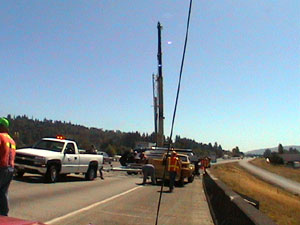 Jerry took control of the scene, ordered a crane, and figured out how to get the whole mess off the road without doing further damage to the boat. Here are some pictures from the scene. Notice that the pickup and boat trailer are sitting on the bridge facing the opposite direction they should be.