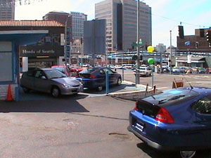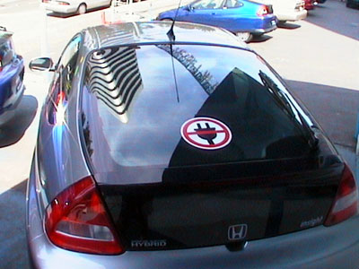 I had four "Insightings" today but they were easy. All four are 2001 CVT Insights at the Seattle Honda dealer. There were red, silver, and two blue cars on their lots. They also had a Civic Hybrid but it was out on a test drive. They sell them with a cool sticker on the rear window that's part of a marketing program. I asked a guy at the dealership (they are open on Sunday!) about getting one of the stickers and he said that they don't have them for sale. It's a shame because it's a cool sticker!