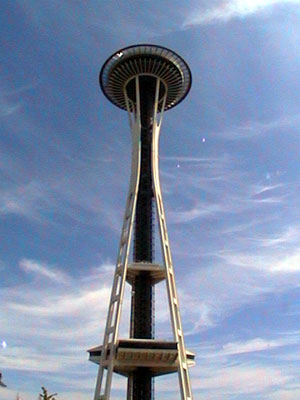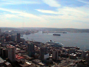 The Space Needle is a marvel of engineering. It stands 520 feet in the air and the viewing deck and rotating restaurant are accessed by a high speed elevator that wisks tourists to the top in less than 50 seconds. The view from the top is outstanding but a little cloudy this morning. People think that it always rains in Seattle when in fact it receives less than 60 inches of precipitation each year. It is a very cloudy, dreary area with less than 100 days of sunshine. The Olympia Mountains block most of the rain producing clouds.