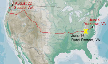 I met up with two riders at a restaurant who are brothers. I would guess one is 28 and the other is 24. One is from Philadelphia and the other lives in Maryland. They too are heading westbound but are moving at a very leisurely pace. They started on June 2 from Yorktown; one full week before me. I caught up to them in just eight days. The younger brother is having great trouble with his knees - it seems to be tendonitis. He pushes his bike up most hills and coasts back down. They are only heading as far as Montana in the next few months.