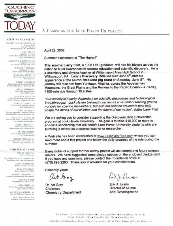 The Discovery Ride kicked off during the LHU Alumni Weekend (June 7-9, 2002). Alumni and friends of the University had an opportunity to talk with Larry Flint ('98) and see his bicycle at Seig Conference Center during Saturday evening's pig roast (June 8th at 4:00pm). Larry began his journey in Yorktown, Virginia the very next day. |